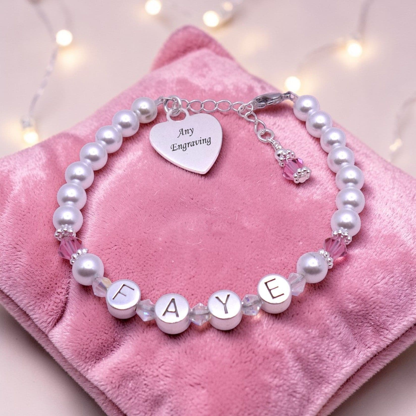 Delicate girl's personalised birthstone bracelet with a custom engraved charm, handmade with beautiful, high grade Preciosa pearls and crystals. This lovely Birthstone Bracelet is made in the UK by us in our workshop in Norwich. It can be personalised with any engraving and birthstone of your choice to make a truly unique gift for a girl to keep and to treasure for many years to come.